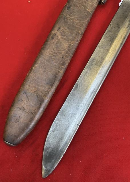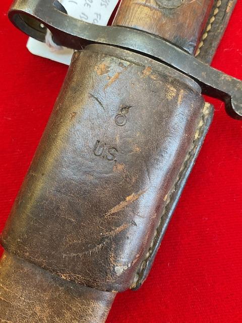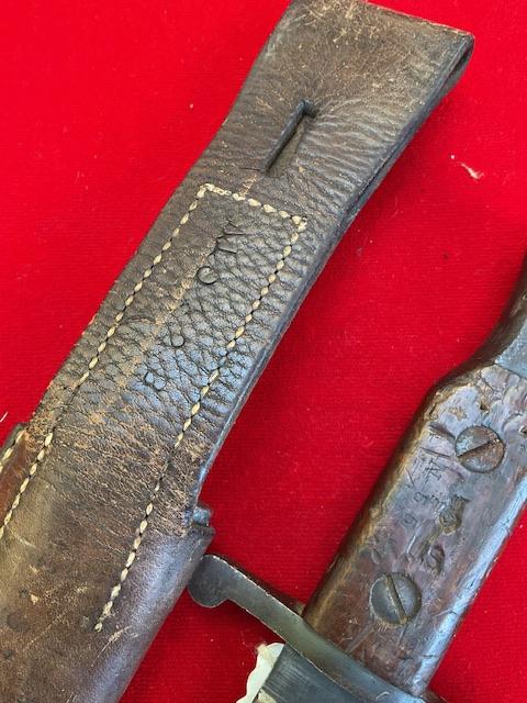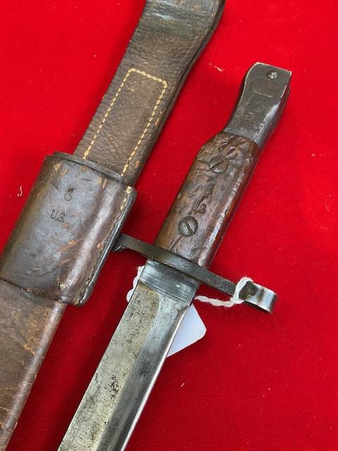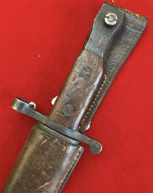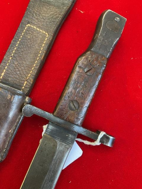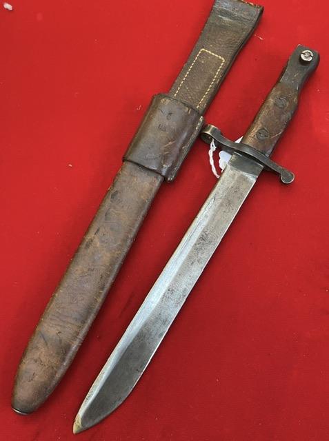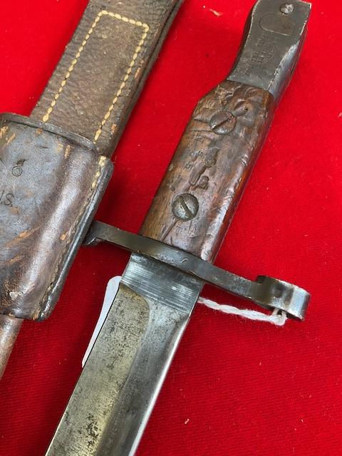 A very rare bayonet to find, Mk1 American Ross bayonet, Blade in good condition with age staining, wood gripes securely attached, press stud in working order, inside muzzle ring correct detail for USA issue. Scabbard marked up US. All in excellent condition and rare bayonet.