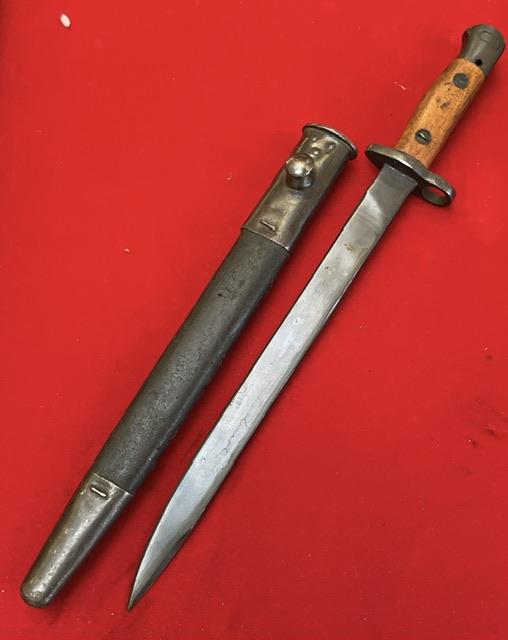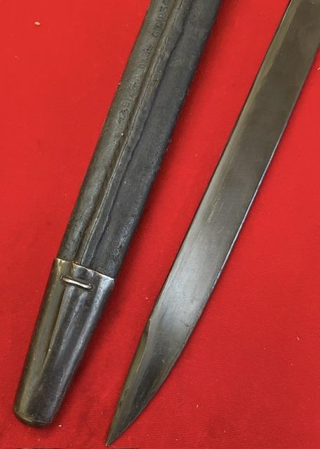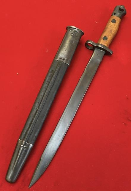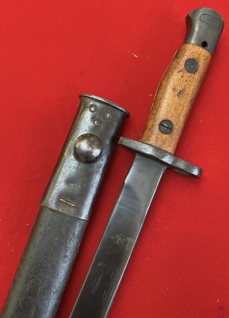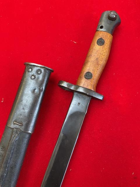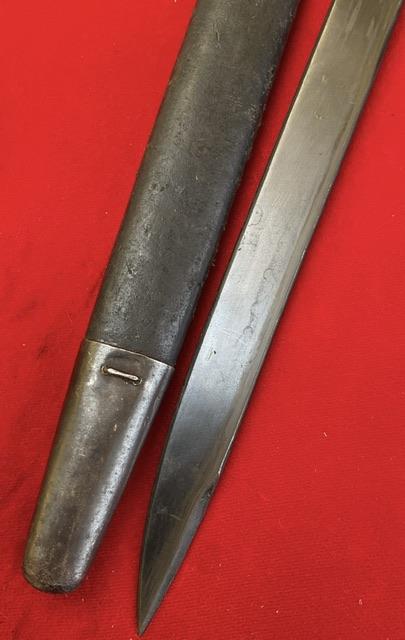Mint blued blade, false edge. Excellent wood grips, press stud in working order, excellent leather scabbard with mounts firmly attached.