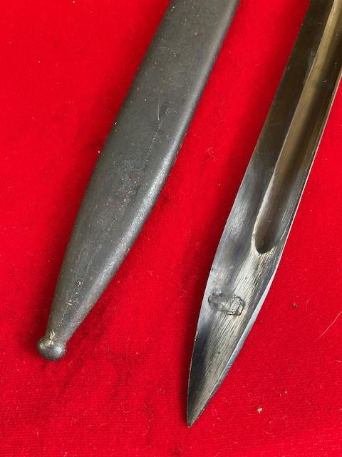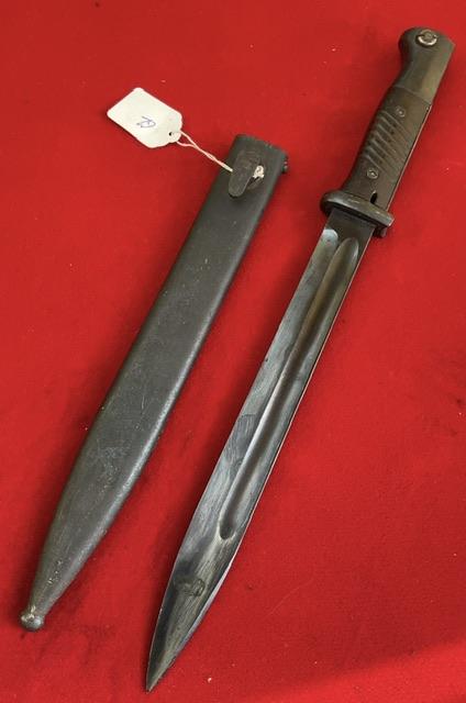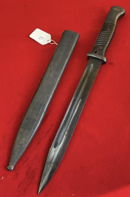 Here I sa different K98, blade marked 42COF and scabbard cof43, but not numbered. Blued blade, dent free scabbard, Bakerlite grip, press stud in good working order. Very rarer variation.