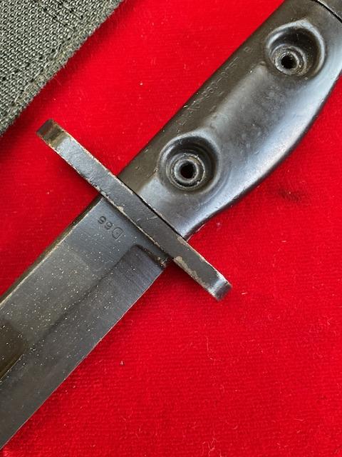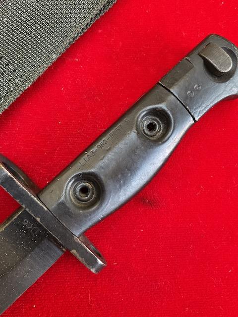Excellent condition L1A3 bayonet, 3/4 fullered length blade, dent free scabbard, releasing catch in working order, comes with frog Age restricted item