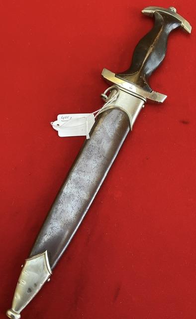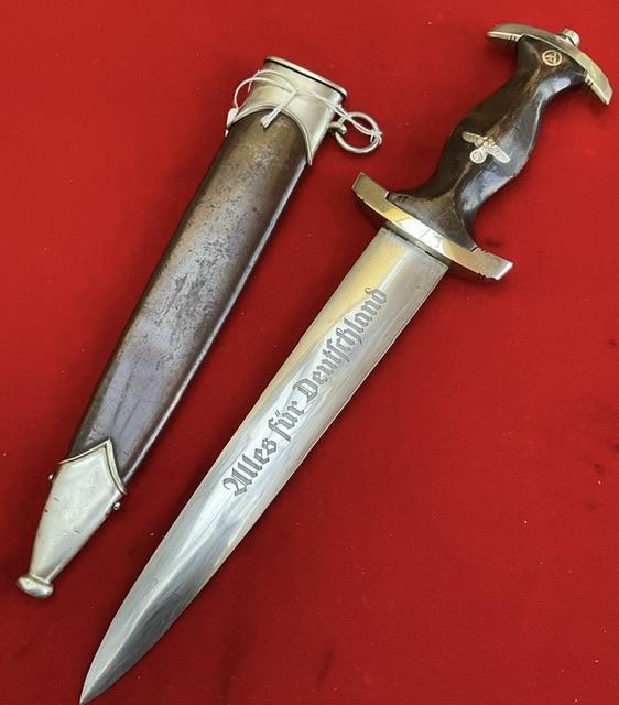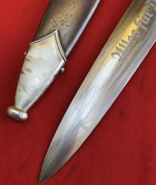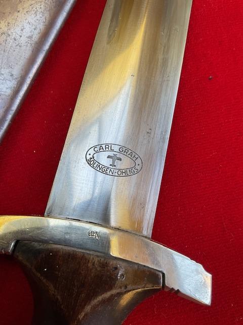 Rarity of 9, blade in excellent condition, no rust or nicks, cross grain remaining, with minor runner marks. Anadoised dent free scabbard, nickel fittings, screws un turned, minor dents to bottom fitting. Grip fits perfect to cross guards, overall EXC++ item for very rare maker.