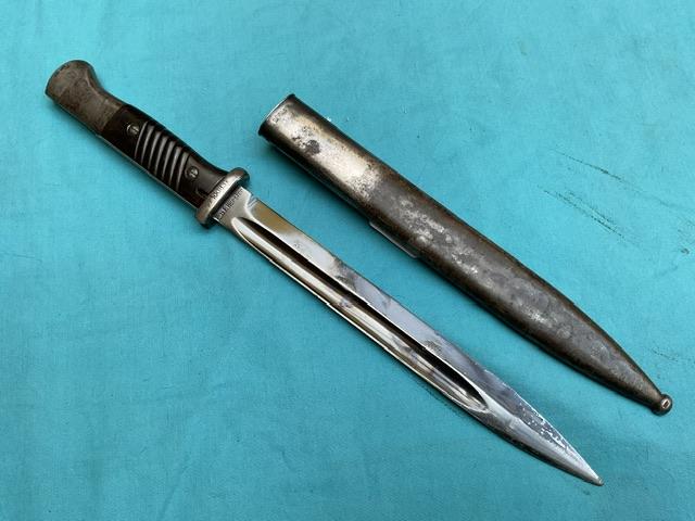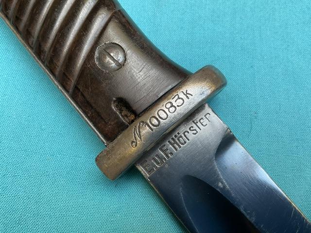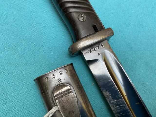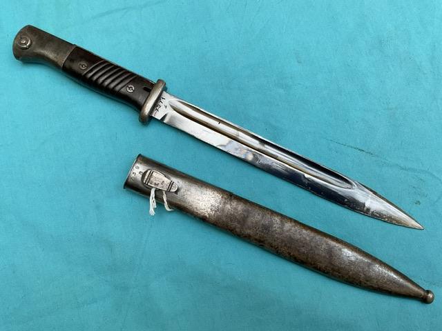 A non matching K98 with naval mark on cross guard. Horster marked blade, blued but showing wear. Bakerlite grip, press stud works, screw missing from scabbard