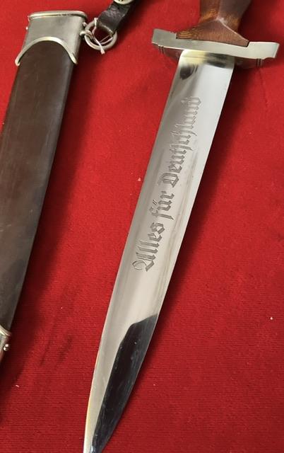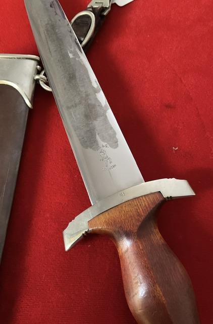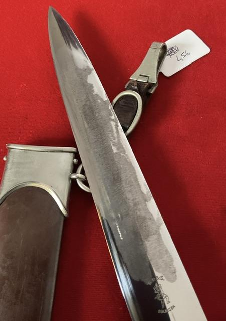 Lovely blade, but Rhom inscription taken off in the field, But blade is in excellent condition.Dent free anadozied scabbard, nickel fittings in good condition, screws un turned. Grip fits perfect to cross guards, Comes with 1 piece hanger.
