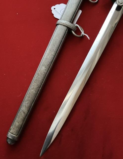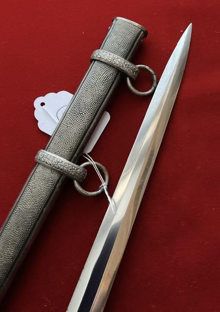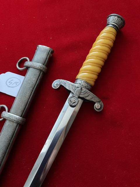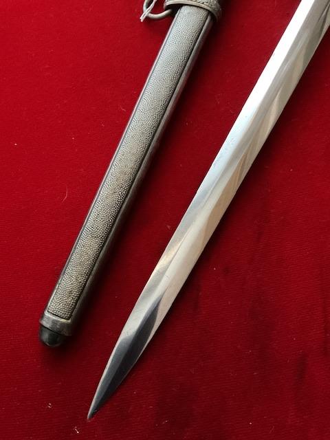 Richard Herder Army dagger, scarce maker, nice bright blade with no nicks or rust marks. Washer in place under cross guard. Dent free scabbard, Stunning light orange grip.