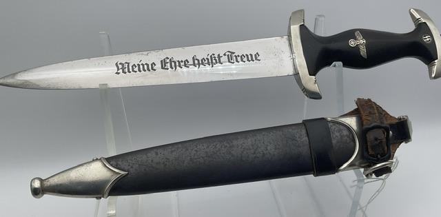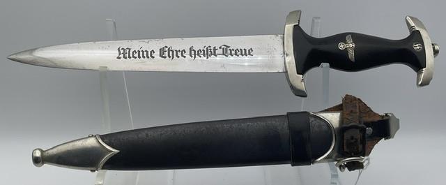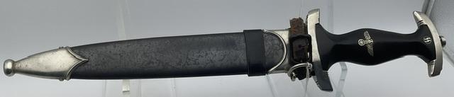 Anodised scabbard which is correct for this period of dagger, no dents or rust marks, nickel fittings in excellent condition, minor flat area to bottom ball. Grip and cross guards excellent fit with no chips out of grip.All nickel fittings, comes with black vertical hanger which has been on there for a long time as it has shown wear round the anodised scabbard. Shows wear but leather intact. Overall a very rare dagger to find.