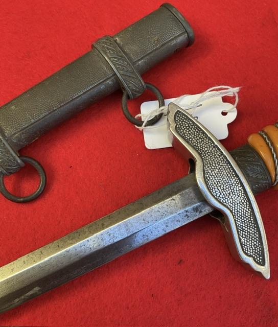 A very rare item to find, plain bladed birthday dedication on blade, possible research item. Blade shows staining. Dent free scabbard, Nice orange grip, wire is tight, Nice gold wash to pommel swastika.