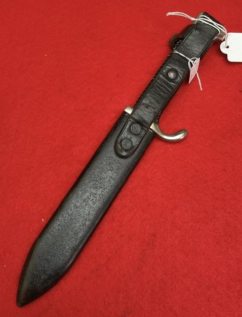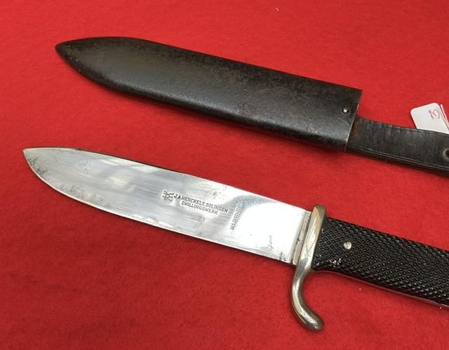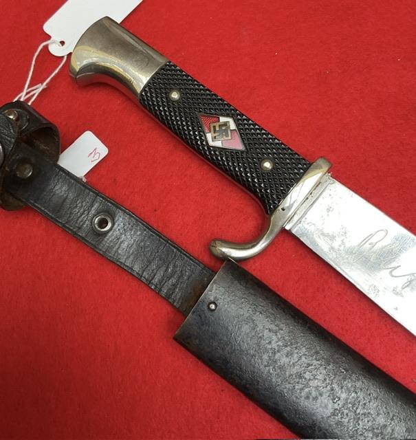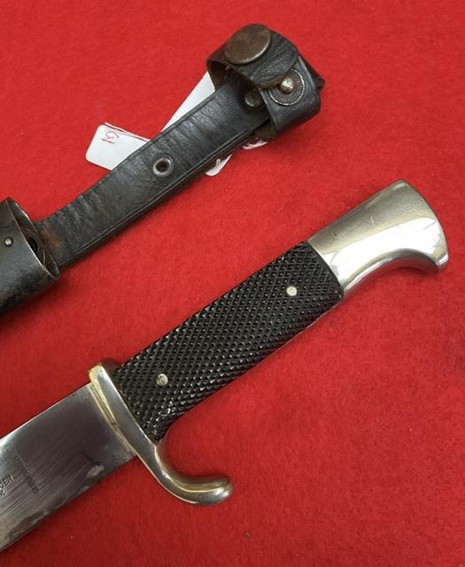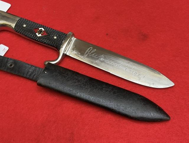 Early production HJ knife by Henckles, motto on other side of blade, No nicks or rust on blade, Dent free scabbard, Grip in perfect condition, pommel and cross guard in mint- condition. Leather hanger and retaining loop in excellent condition, no tears and rivets very secure. Very early scarce HJ dagger