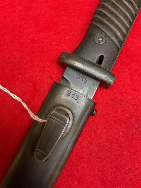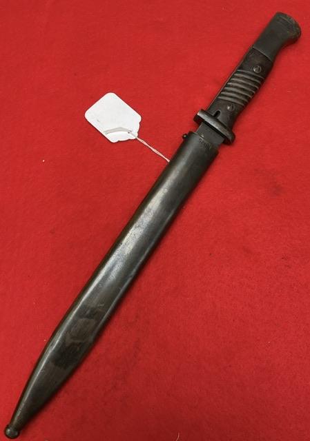 Matching number K98 bayonet, S174 1936 dated, blued blade in excellent condition, dent free scabbard, Bakelite grips,securely attached. Press stud in working order. Age restricted item