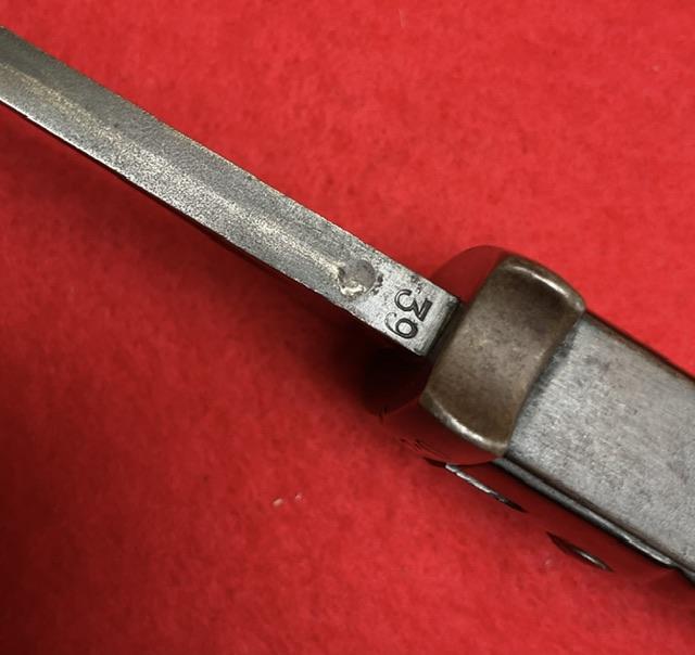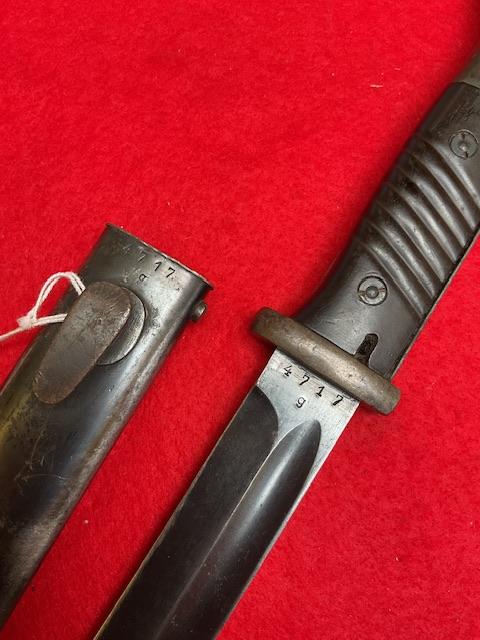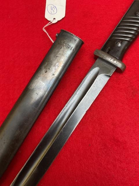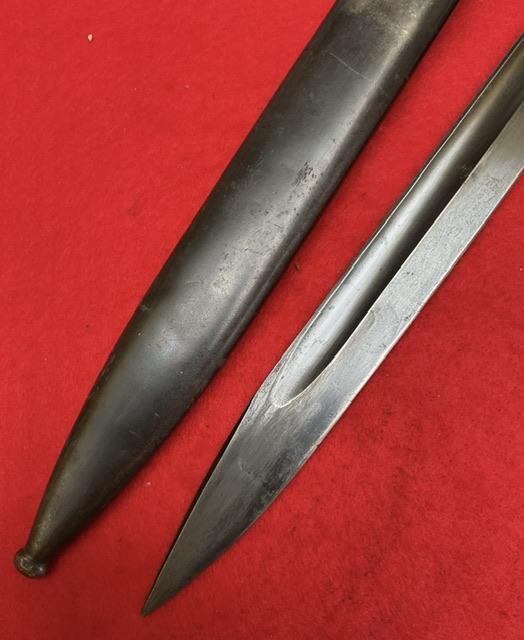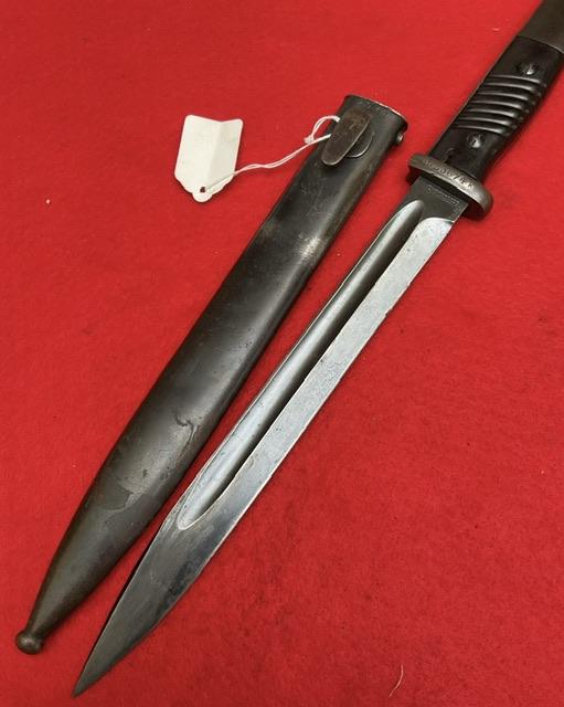 P Weyersberg, 1939 dated. Blued blade with wear at tip, dent free scabbard, baker lite grip securely held, press stud in good working order.