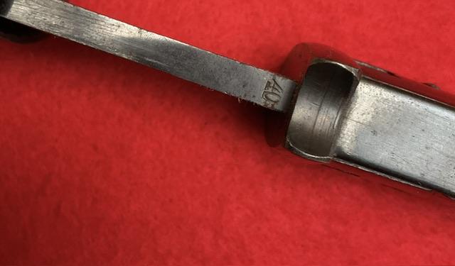 1940 Dated K98 by Berg & Co, 8560 on blade and scabbard, scabbard dated 1940 below trademark, blade dated 40 on spine.Excellent blued blade, dent free scabbard, excellent baker lite grips held securely.