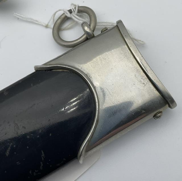 One of the hardest makers of SS33 daggers to find. The blade is in excellent condition, showing general wear, but no nicks or rust marks. Period painted scabbard which tends to go with this maker of SS dagger. Paint in excellent condition, dent free scabbard and no bubbling. Nickel fittings, screws unturned, very minor dent to bottom of ball. Grip in perfect condition with excellent fit to cross guards. Very rare dagger to find.