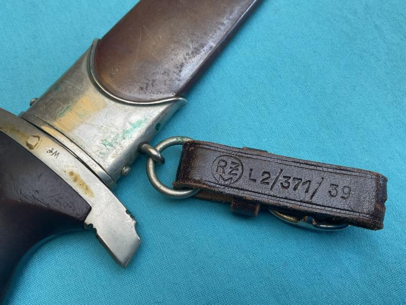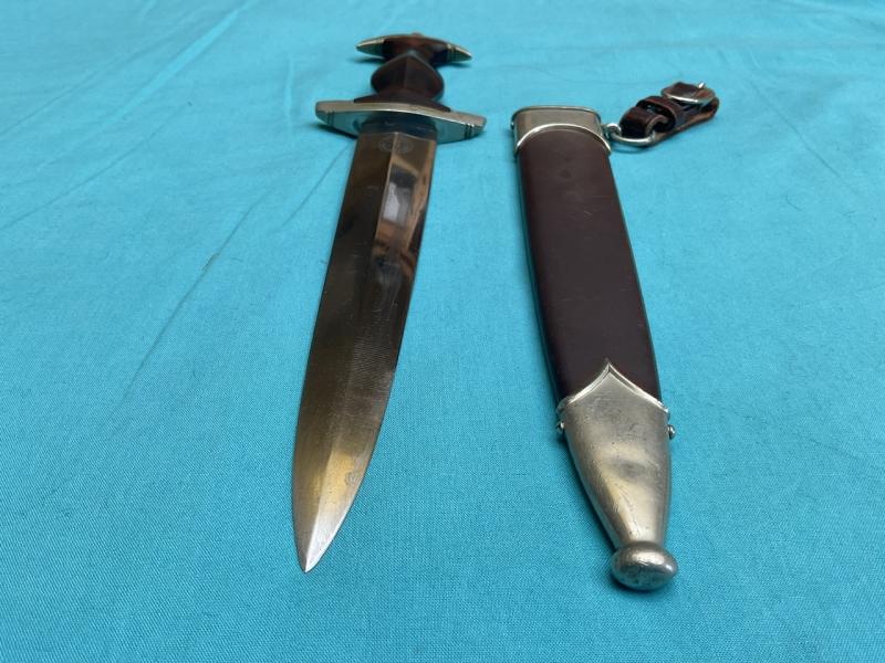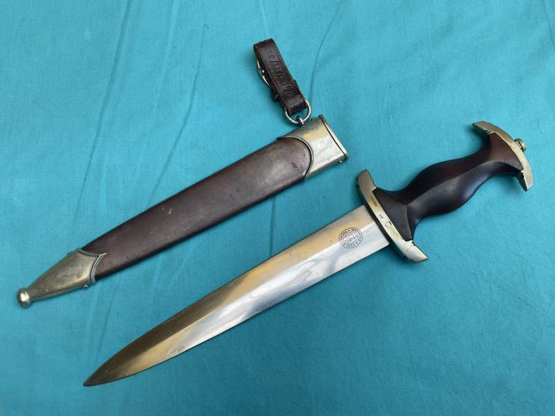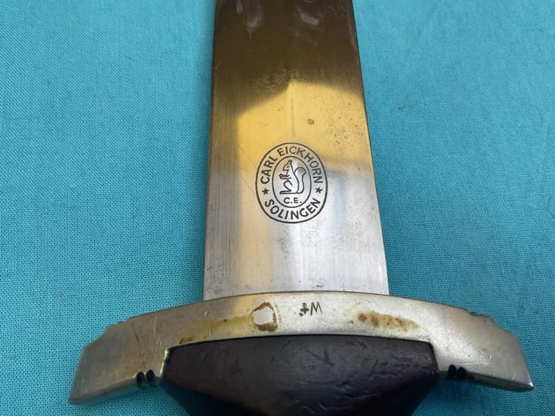 Although Eickhorn SA daggers are common, the large trademark is a scarce one to find.Blade is nice and bright, no nicks or rust spots, has runner marks. Nice anadozied scabbard, no rust or dents.Un turned screws to fittings.Chip free grip just minor indents, fits well to cross guards. Comes with 1 piece hanger which is RZM marked. Overall EX+ item