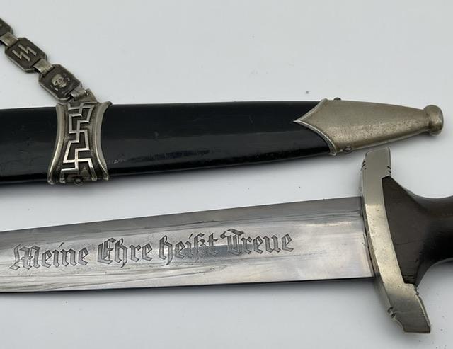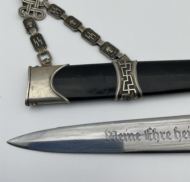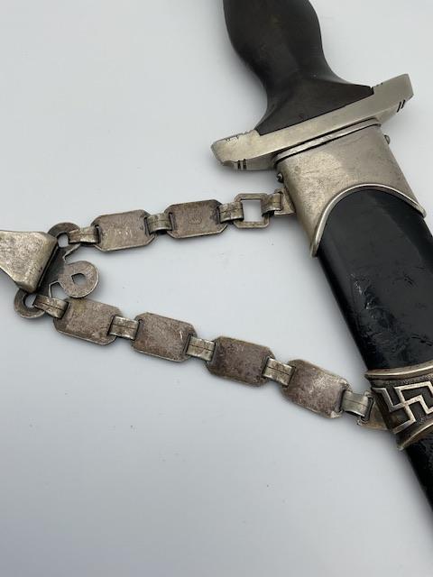 Initial production 1936 SS chained dagger. Blade is mint-, stunning condition, minor runner marks, no nicks , rust be hard to improve. Painted scabbard which is period done and initial production, typical paint reaction with metal scabbard. Single screw to middle mount which is correct. Lovely fit to grips and cross guard, no numbers on lower cross guard again correct so not parts dagger. The chain is stunning with the typical period wear to clips when warn,top sprung clip in working order. Overall a stunning SS Chained and hard to find in this condition.