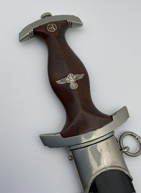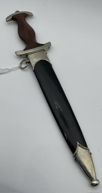 Near mint blade, no nicks, shows cross grain, minor runner marks.Mint black painted period done scabbard, just a couple of very minor nicks to paint but overall mint-.All nickel fittings, No dents or nicks to grip, excellent fit to grips. Exceptional quality NSKK