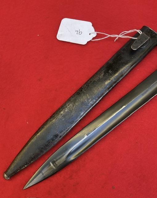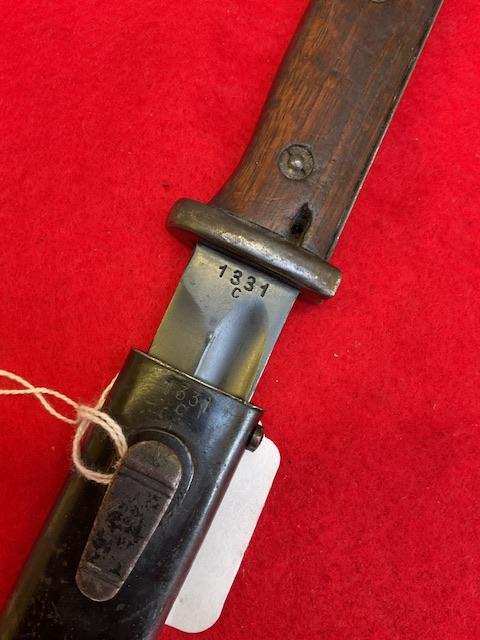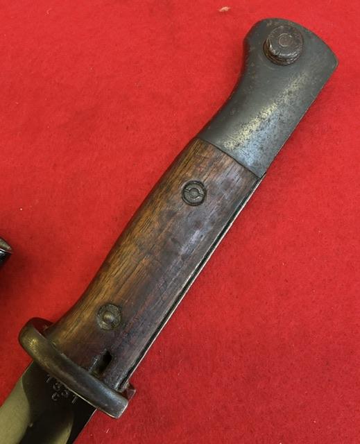 Matching number 1331c K98 S185G code, non dated. Nice blued blade, shows wear where runners are but no nicks or rust marks. Dent free scabbard, wooden grips nice and secure, press stud in good working order.