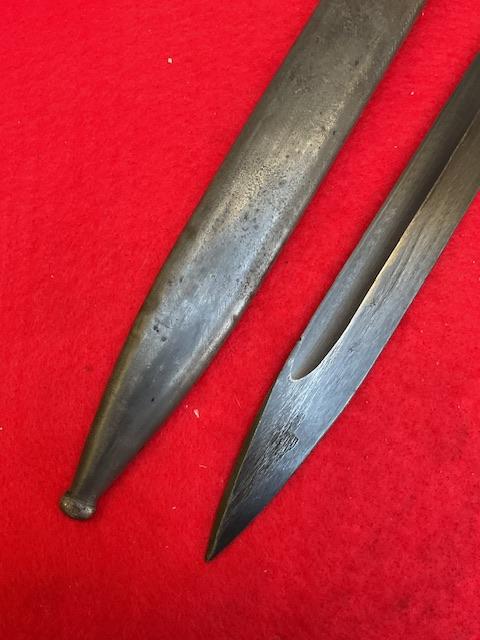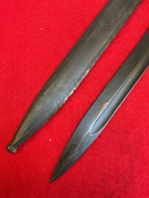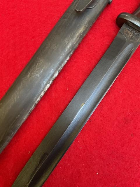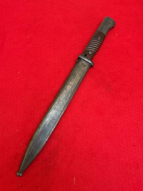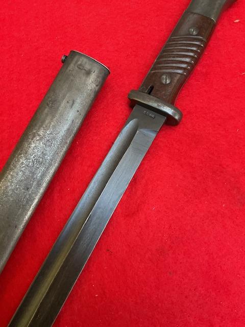 Scarce maker K98 AB44, nice blued blade, only minor wear, dent free scabbard, baker lite grips. Press stud in good working order. Age restricted item