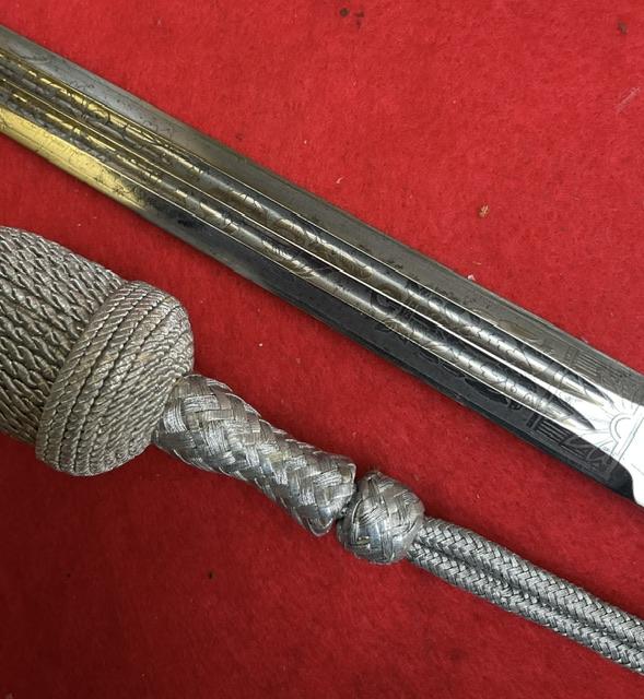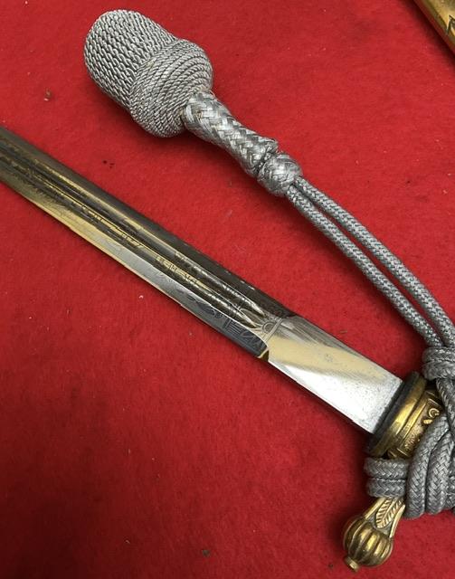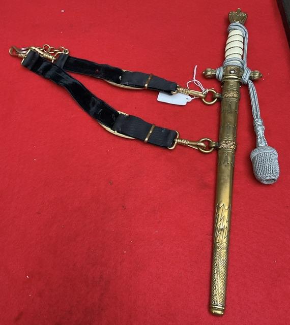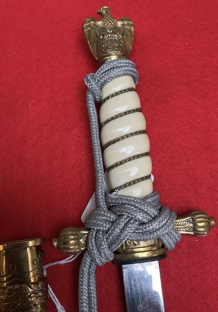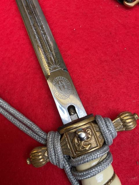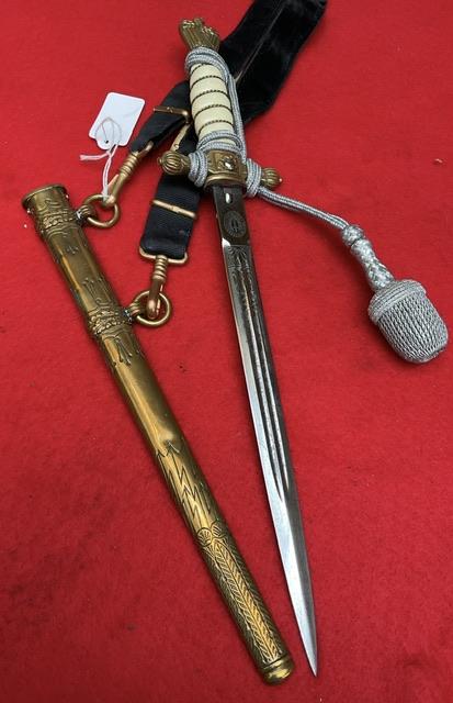A lovely full rig 3rd Reich naval dagger by Paul Weyersberg, Mint - sailing ship blade, lightning blast scabbard, Perfect grip with wire nice and tight, Navy knot in excellent condition with no fraying, complete with early brass hangers in excellent condition, Lovely full rig.