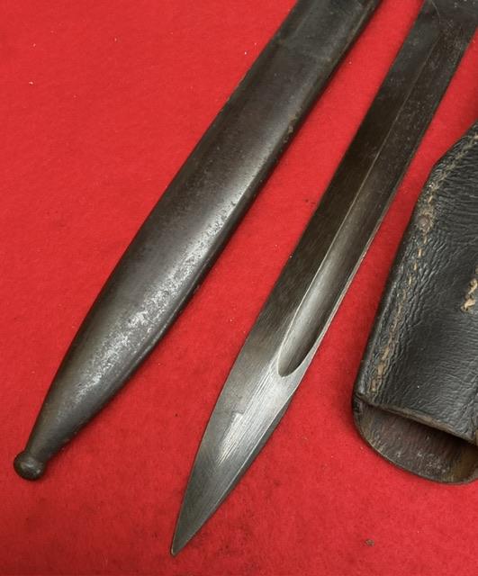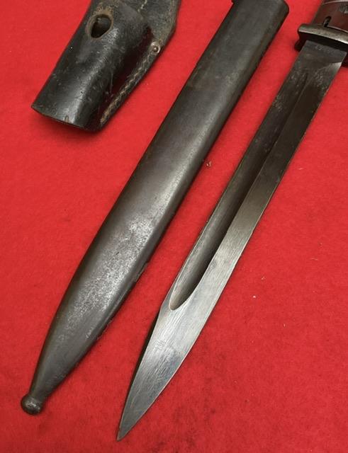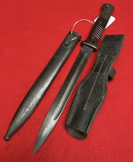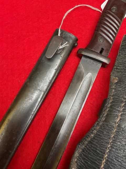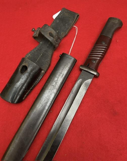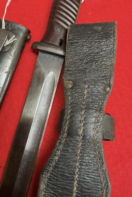 Matching numbers K98 DDL 43 dated, nice blued blade with minor wear. Dent free scabbard, baker lite grips securely held in place , press stud in good working order. Comes with nice leather frog.