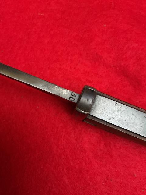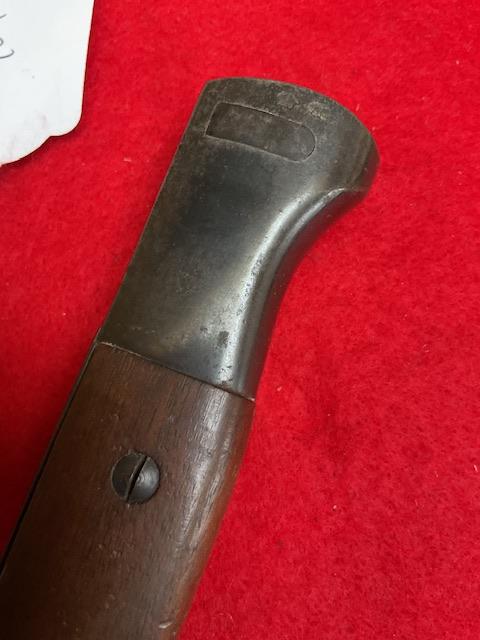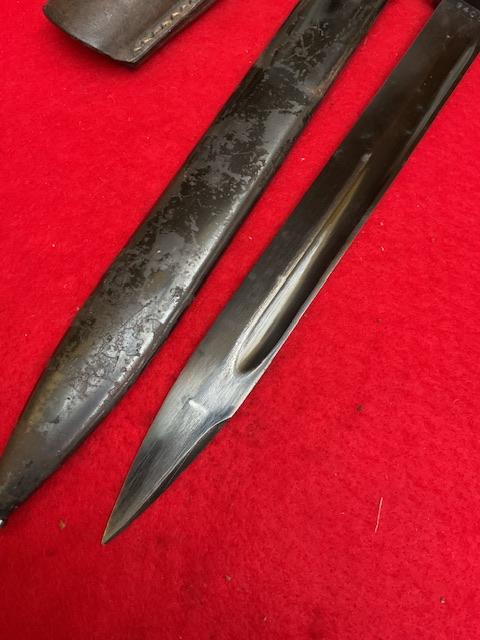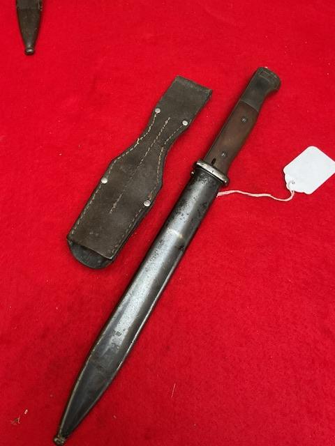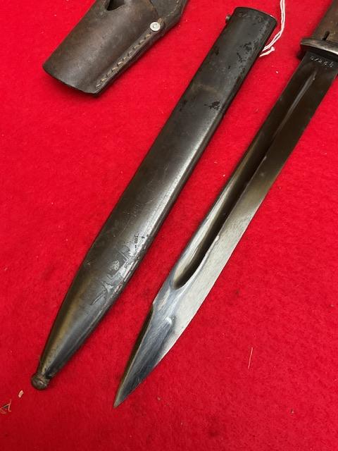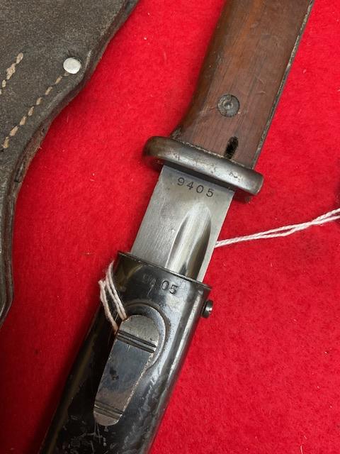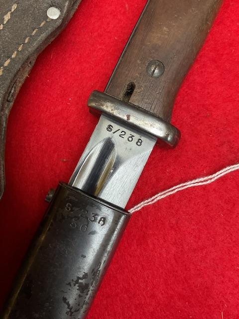 Matching S code 238 K98 bayonet, nice blued blade, with usual minor wear, nice dent free scabbard, excellent wood grips, release catch in good working order. Age restricted item