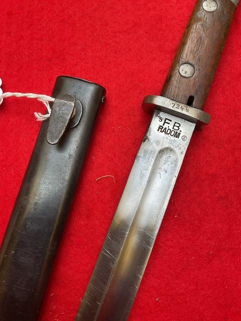 Polish Radom bayonet, excellent blade no rust marks, dent free scabbard, wood grips in excellent condition, press stud in good working order. Age restricted item
