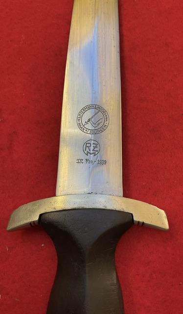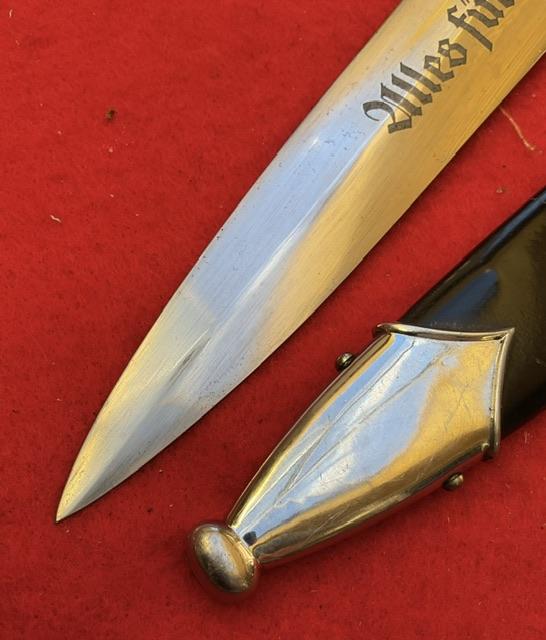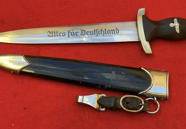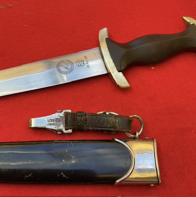 An extremely rare SA Marine Dagger, double market RZM and Klittermann & Moog. Blade in excellent condition, mo nicks or rust marks., Painted scabbard which you would expect to see. Plated fittings to scabbard, un turned screws. Minor split to ball. Black SA grip and marking on blade denoted marine, nickel fittings fit well with grip, comes with 1 piece hanger.