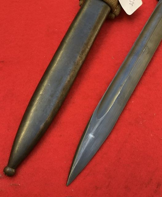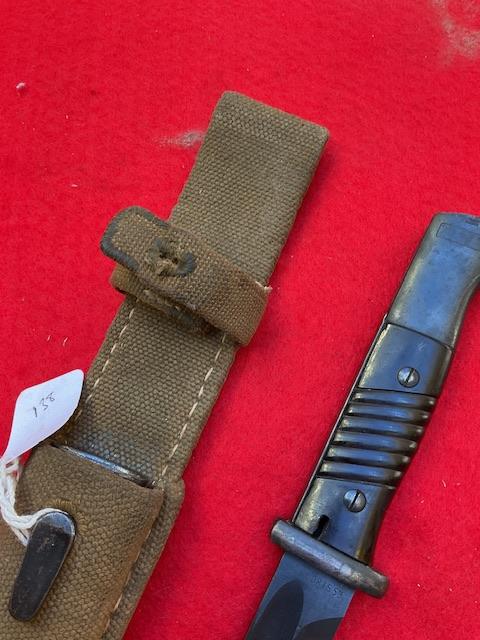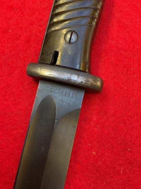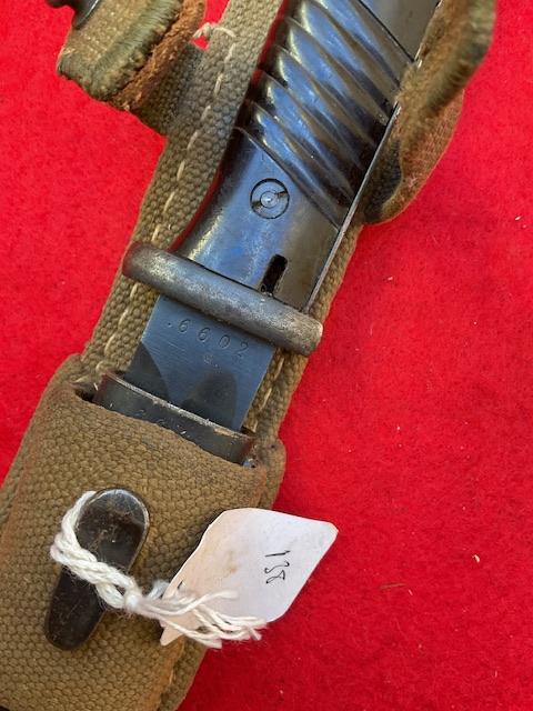 A matching 1939 K98 by J Corts,, excellent blued blade with very minor wear. Dent free scabbard, Baker lite grips securely held in place. Release catch in good working order. Comes with mint DAK tropical frog,, In near mint condition, stitching perfect.