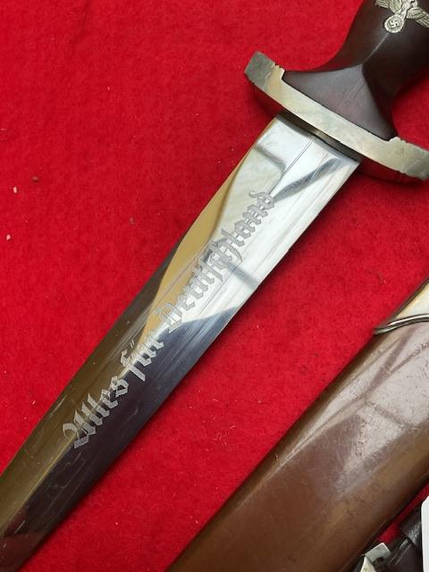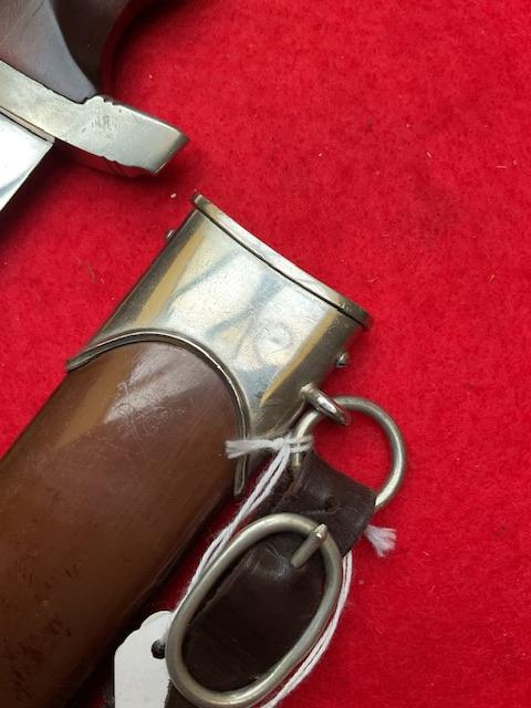 SA by W Wagner, stunning blade with majority of cross grain, minor runner marks, anodised scabbard shown lacquer, all nickel fittings, screws un turned, grip has excellent fit to cross guards.