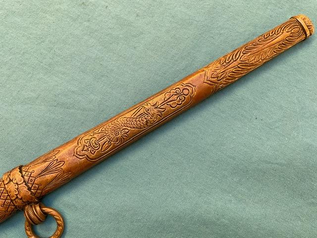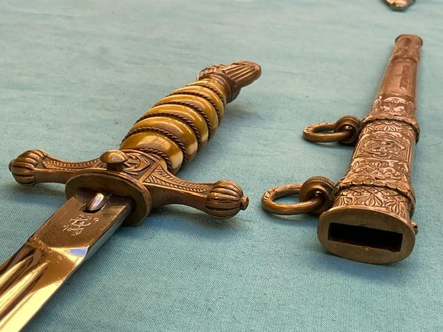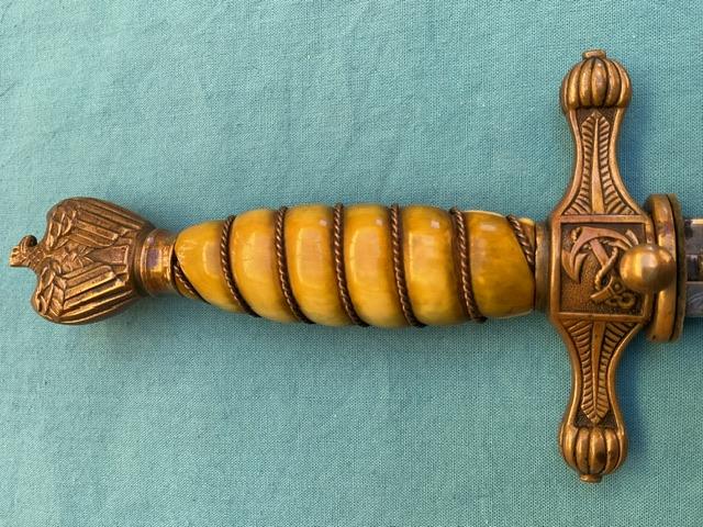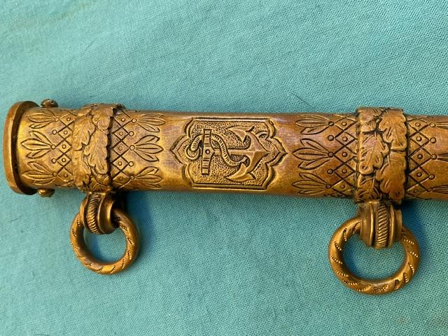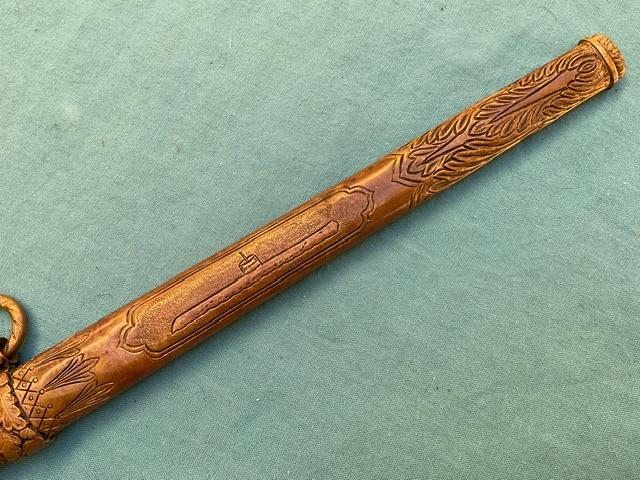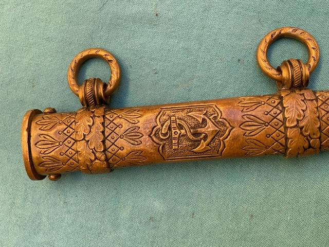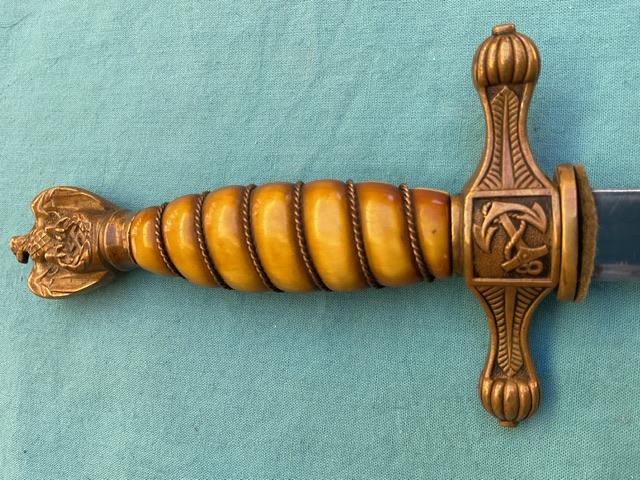 This is a lovely example of navy dagger. The grip is horn and varies in colour from off white, yellows to browns, wire nice and tight. Ornate scabbard with anchor, sub etc, Blade is plain and maker marked. A very unusual item to find.