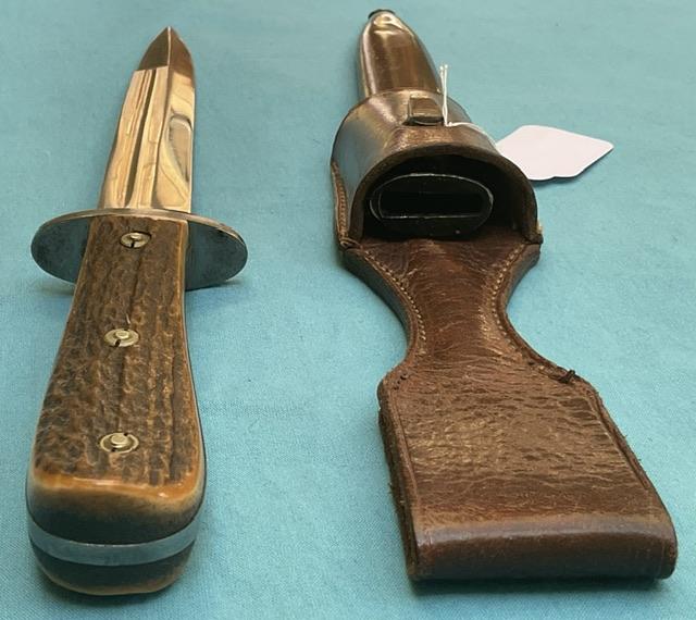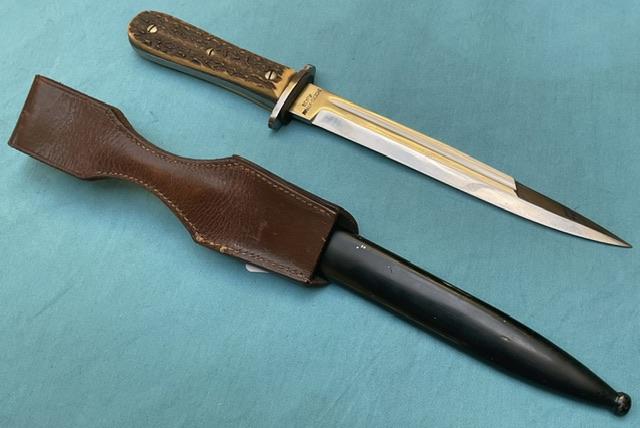 Lovely condition, grip has no chips, held nice and secure, painted scabbard with very minor chips. Maker marked blade, near mint with no blemishes. Washer intact and correct frog. Overall Mint -