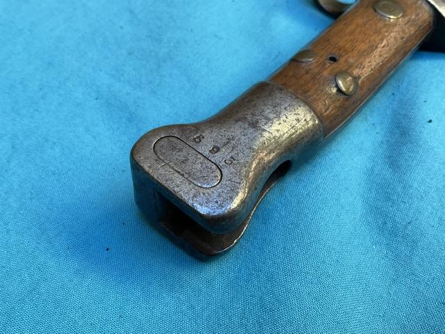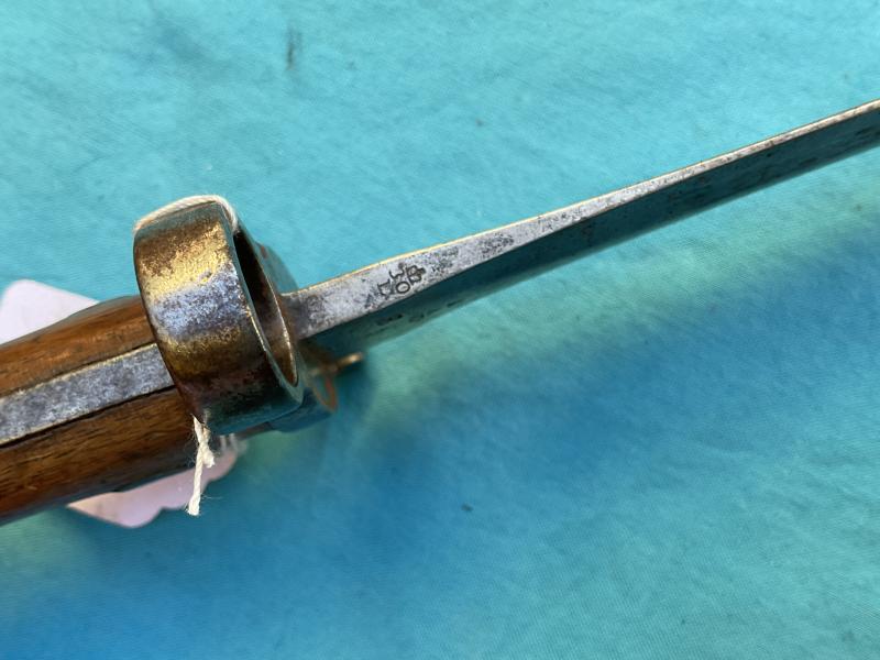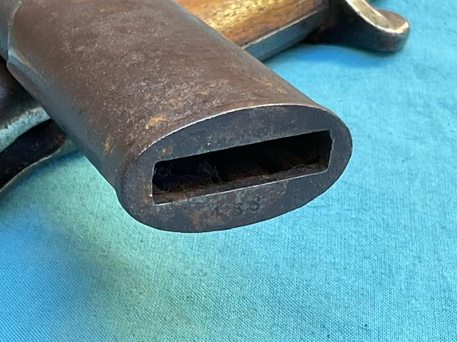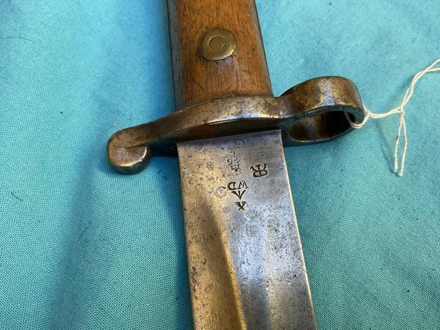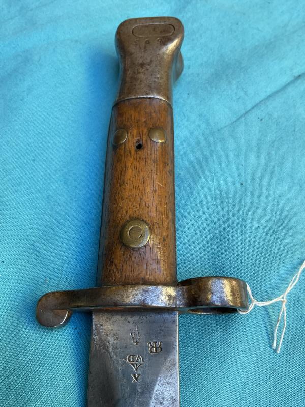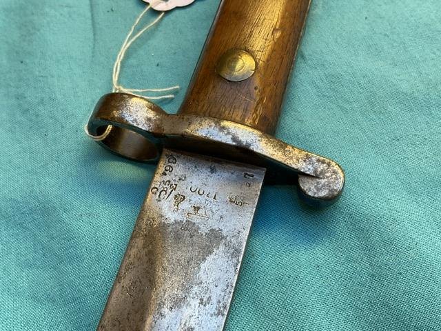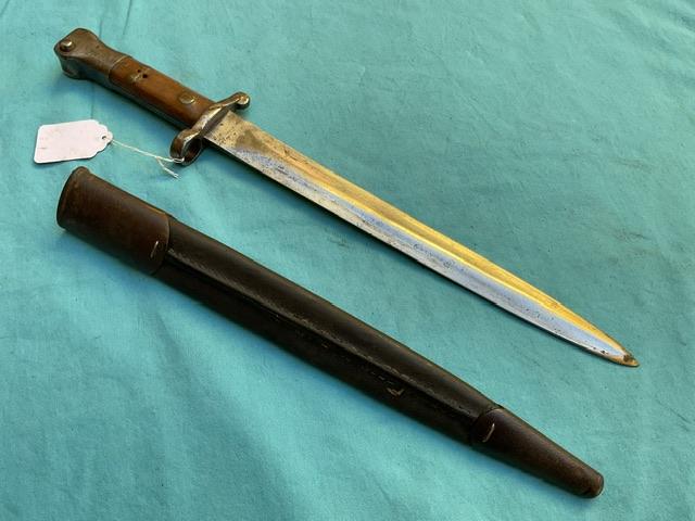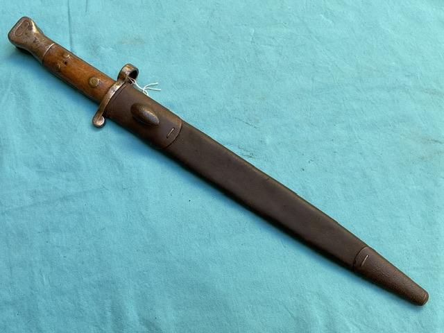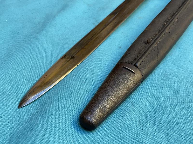 A rare early Lee Mitford in good condition, Blade shows wear, leather scabbard in good order with top and bottom mount in good order and staples in place. Nice wood grip with no splitting.