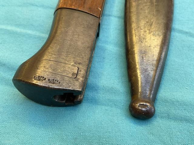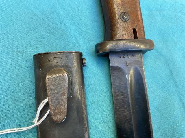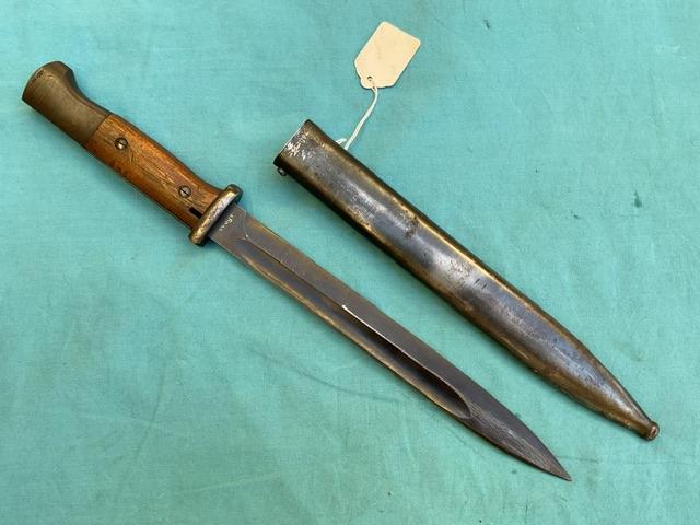 1944 Dated K98 by Berg and Co, a very rare maker of bayonet and date.Blued blade in Ex condition showing wear but no nicks. Wood grip, press stud in working order, Scabbard shows wear but no dents.